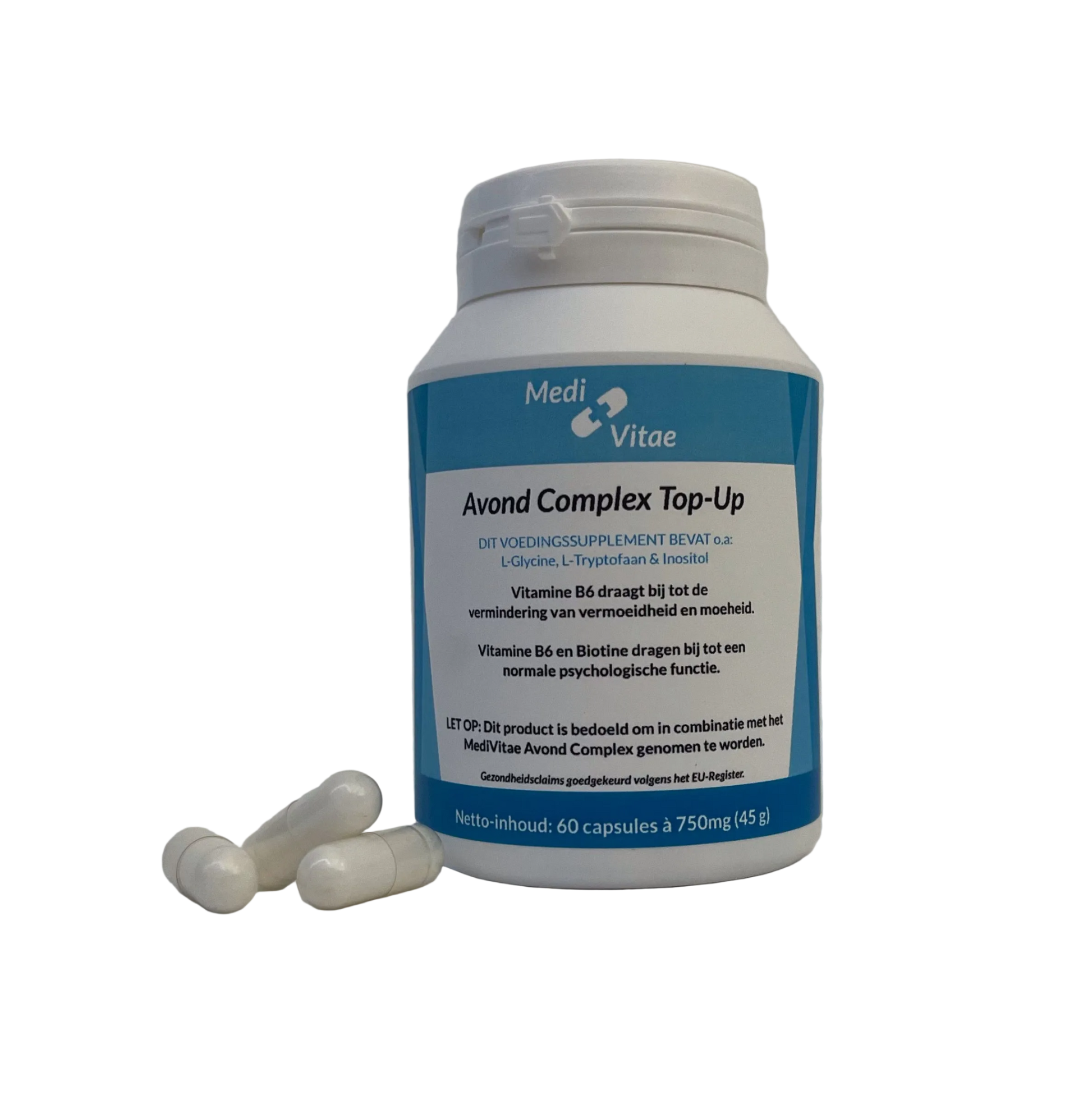Medivitae Avond Complex Top-Up is bedoeld als toevoeging aan de Medivitae Avond Complex, en combineert L-tryptofaan, Glycine en taurine met inositol en vitamines B6 en biotine in capsulevorm voor gebruik in de avond.