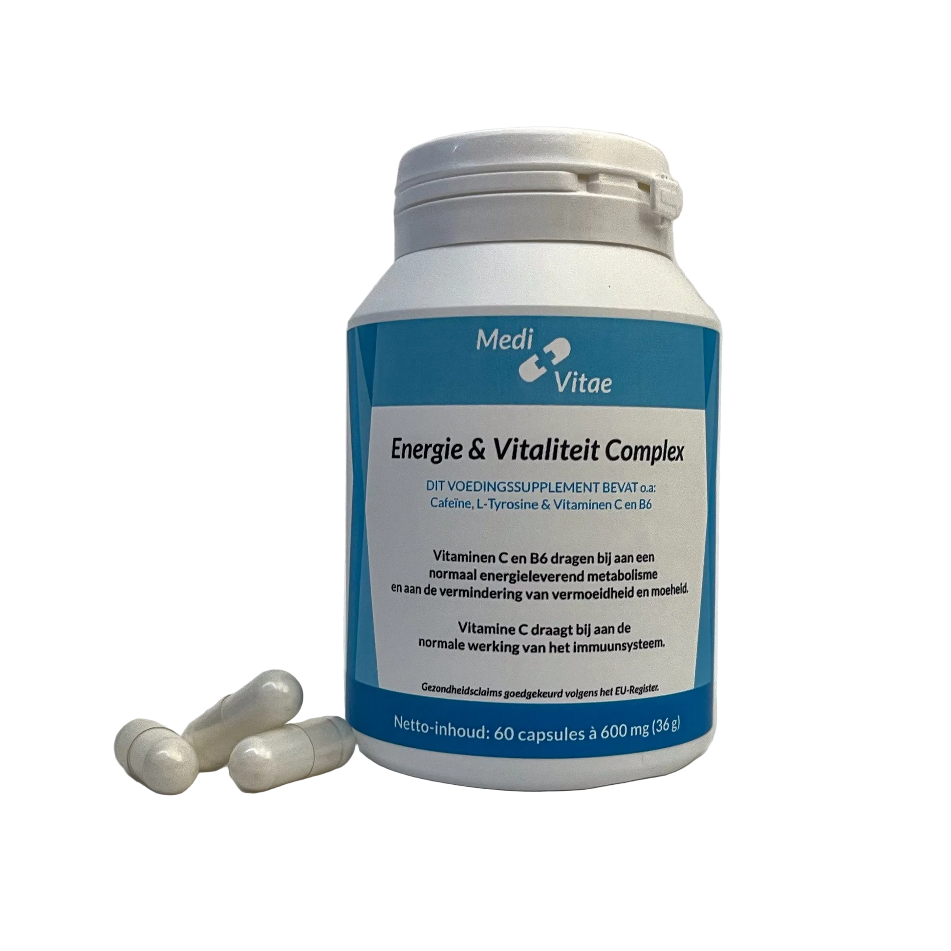 Energie & Vitaliteit Complex combineert aminozuren L-tyrosine en taurine met cafeïne en de vitamines C en B6 in capsulevorm, geschikt om in te nemen aan het begin van de dag of voorafgaand aan het sporten.